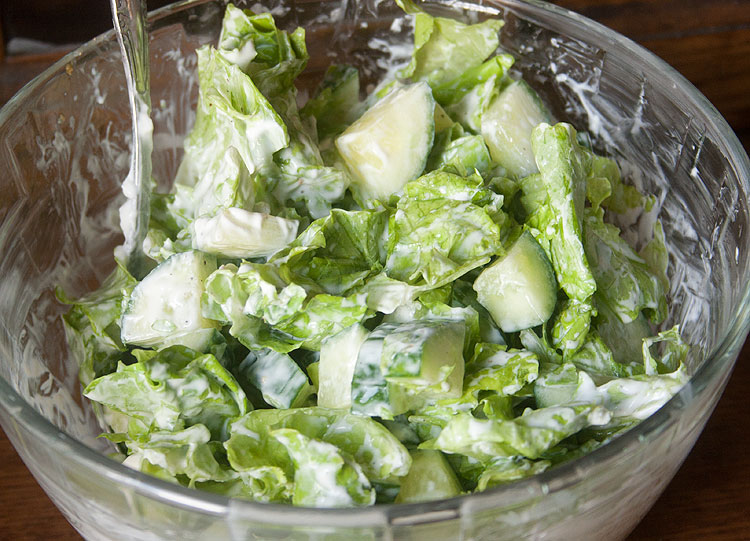 Зеленый такой салат, из травы. Огурцы, листья салата, мягкий творожок, щепотка соли, и один оборот мельнички -- свежемолотый черный перчик.
