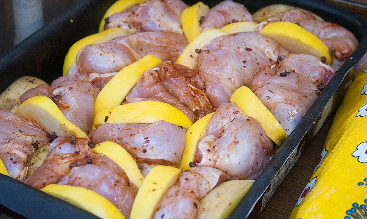 Куриное мясо (под него накидала картошки, между него напихала айвы).