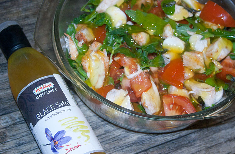 В качестве заправки -- бальзамический соус. В принципе, сюда хорошо подойдет мякоть апельсина или кусочки персика. Но и так офигенно.