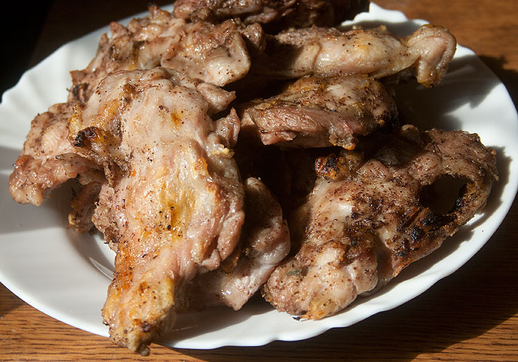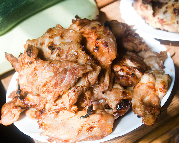 Куриное мясо без костей (я беру филе голени) – смазать солью и перцем. Опционально: можно добавить к смазке соус терияки или еще что-то. Опционально: пусть такое смазанное постоит (от часа на столе или до суток в холодильнике). Распластать на гриле. На моем электро-гриле мясо надо подержать каждой стороной по 8 минут. Но он намного менее мощный, чем шашлычница с хорошим жаром на даче.