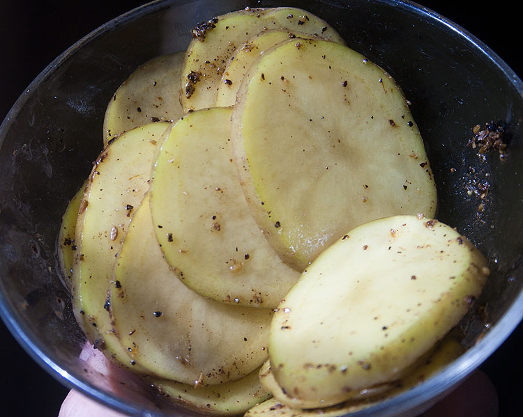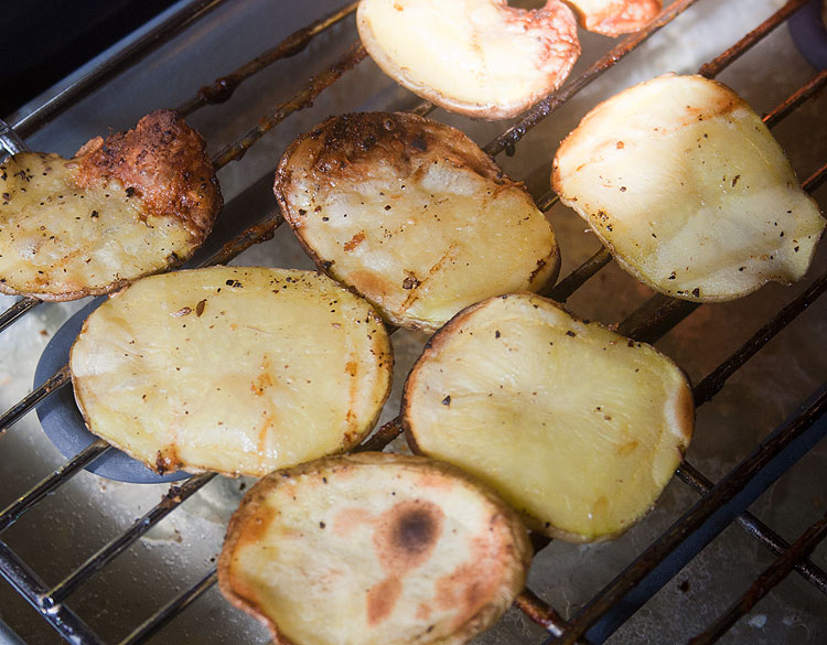 Картошку порезать тонко -- не более 2 мм. К пластикам картошки капнуть буквально 2 грамма растительного масла, щепотку соли, щепотку специй (подойдет сущеный чеснок и/или черный свежемолотый перец и/или кайенский перец и/или все, что душа пожелает). Перемешать. Масло позволит специям и соли лучше закрепиться на поверхности чипс. Разложить по грилю, жарить не долго.