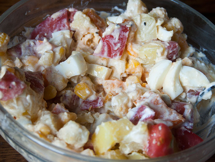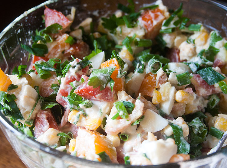 Яйца и картошку сварить. Яйца – опционально, только чтобы салат был сытнее. Можно без них. Порезать кусками. Помидор просто порезать. Консервированную кукурузу откинуть на сито (чтобы стекла жидкость) – и тоже добавить в салат. Заправлять сметаной, посолить, поперчить (опционально).