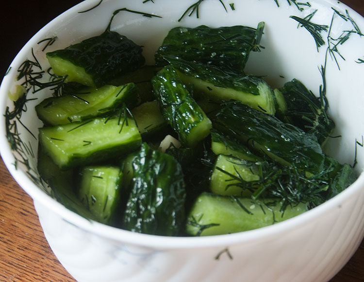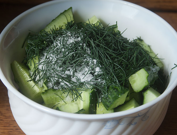 Уже показывала, и даже не раз, кажется. Огурцы посыпать солью, порезанным укропом и порезанным или выдавленным чесноком.