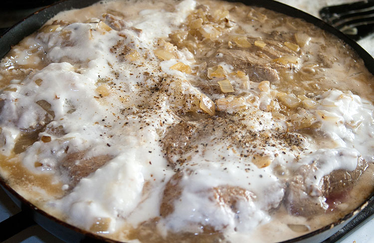 Когда выкладываем медальоны в сковородку, прослаиваем выкладку жаренным луком и сметаной. Посолить-поперчить по вкусу.