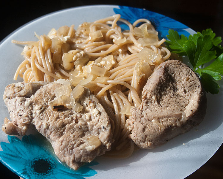 Свиную вырезку разрезаем на медальоны, обжариваем их в той же сковороде, где жарили лук, буквально по минуте с каждой стороны. Если все медальоны сразу не влезают, то их периодически вынимаем, чтобы обжарить новые. В самом конце все возвращаем в сковородку.