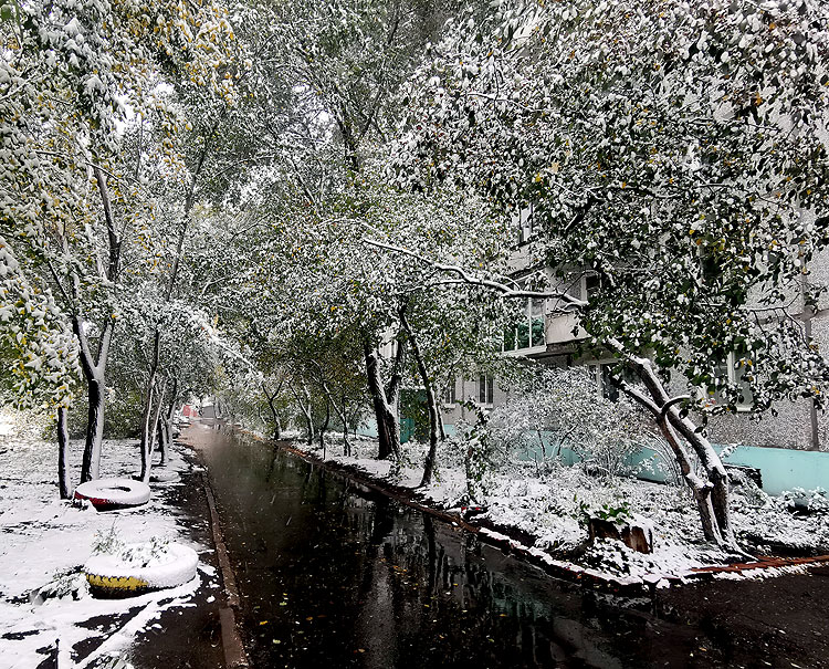 Я специально пошла снимать первый снег. Я знаю, что первый снег – это всегда очень красиво. Это и белый пушистый снег хлопьями, и всегда отражение в каких-нибудь лужах, и необычный для наших широт контраст снега и черного асфальта, и прочее, и прочее. Первый снег – это всегда очень красиво. Наверное, в первый раз в жизни у меня не набралось даже 10 кадров (формат инстаграма) первого снега.