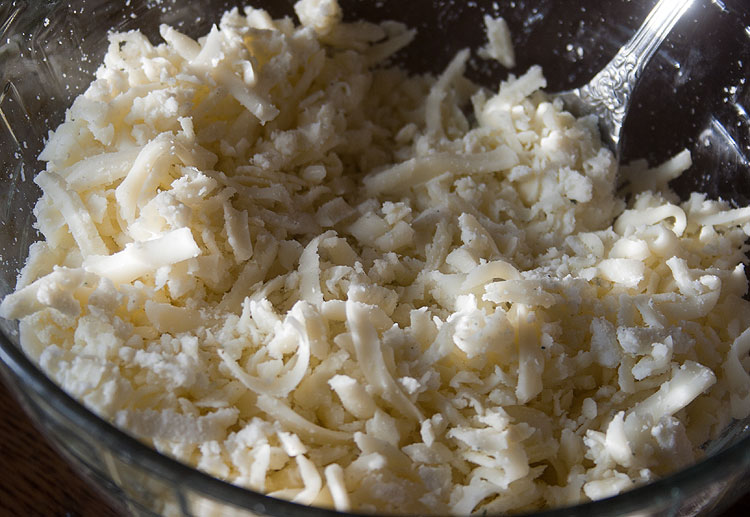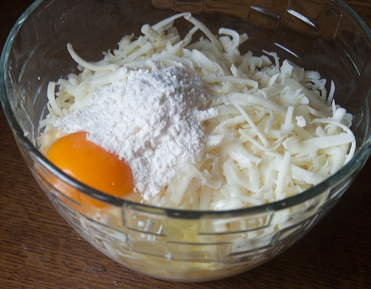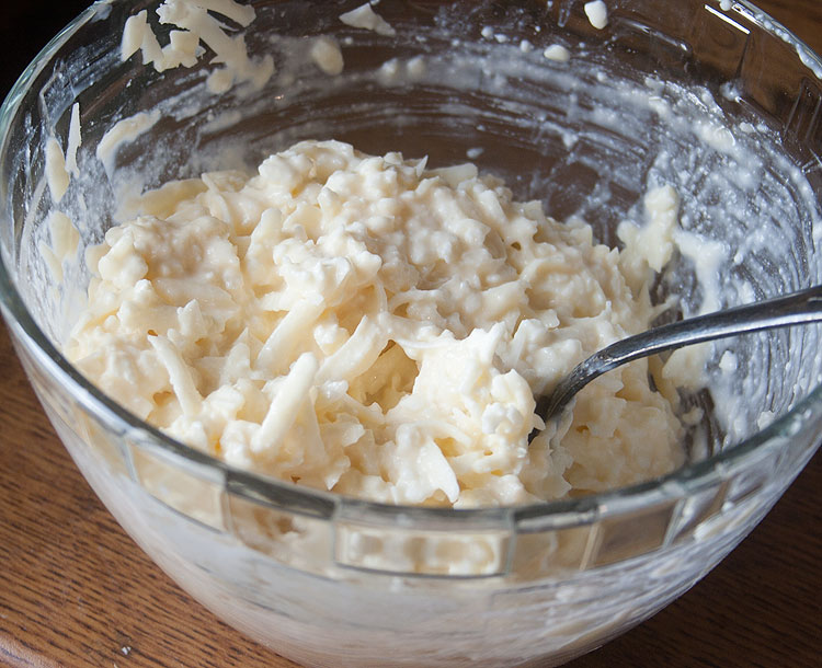На комок 450 грамм теста я взяла около 500 грамм сыра (примерно поровну каждого вида). К тертому сыру вбить яйцо, влить полстакана молока (можно кефира или другой кисломолочки), всыпать ложку муки – как бы такое очень жидкое тесто добавить к сыру. Можно подсолить по вкусу – я не подсаливаю. Можно добавить чеснок, пропущенный через чеснокодавку. По мне так было бы вкуснее – но дети были против, а они основные потребители хачапури в доме.