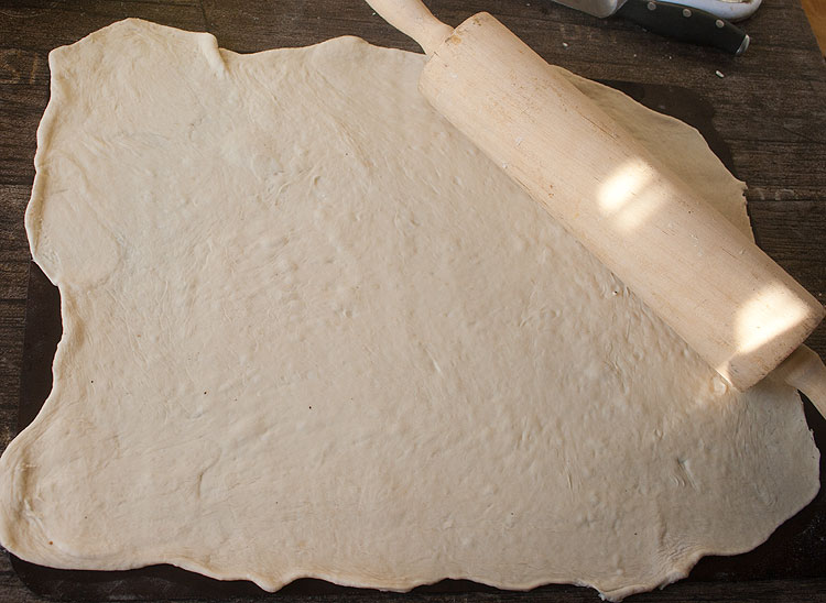 Тесто раскатала. Коврик у меня – по размеру духовки, так вот тесто катать на весь коврик, и можно даже капельку шире.