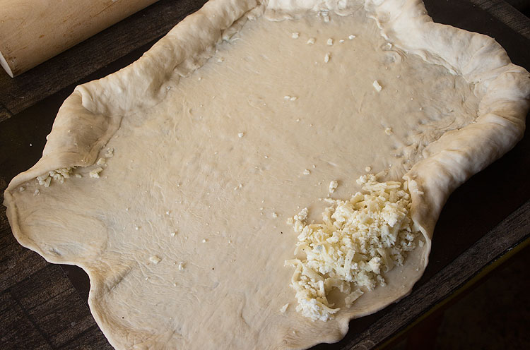 Получается почти прямоугольник размером почти с коврик для выпечки. И почти не осталось сыра (тех 500 грамм смеси “4 сыра”, которые я брала вначале).