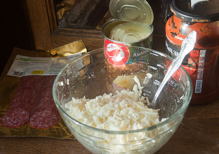 Сыр, колбаса, ананасы, томатная паста (можно взять кетчуп – но у меня какая-то нескончаемая томатная паста).