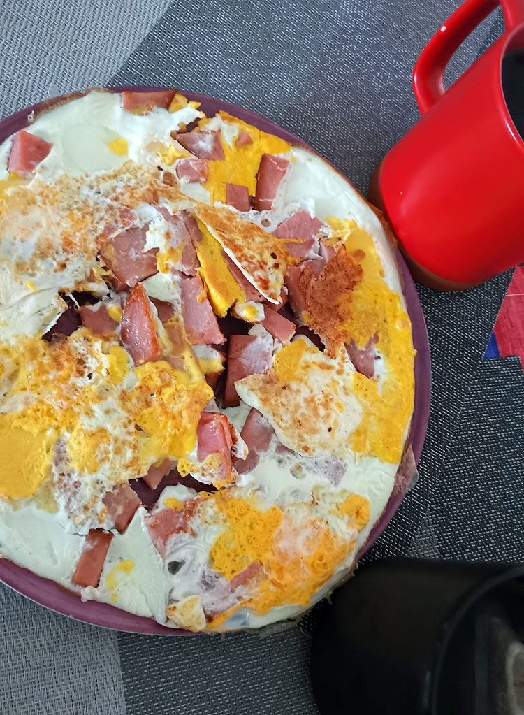 2.Яичница с кусочками чего-то мясного, что нашлось в холодильнике. И чай.