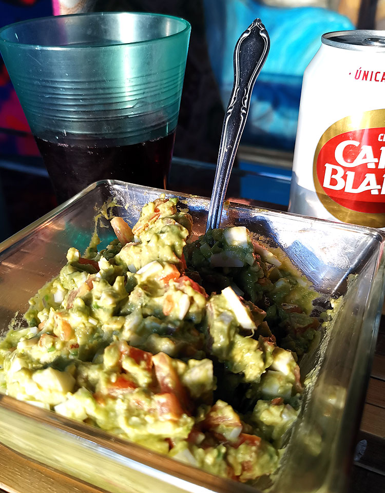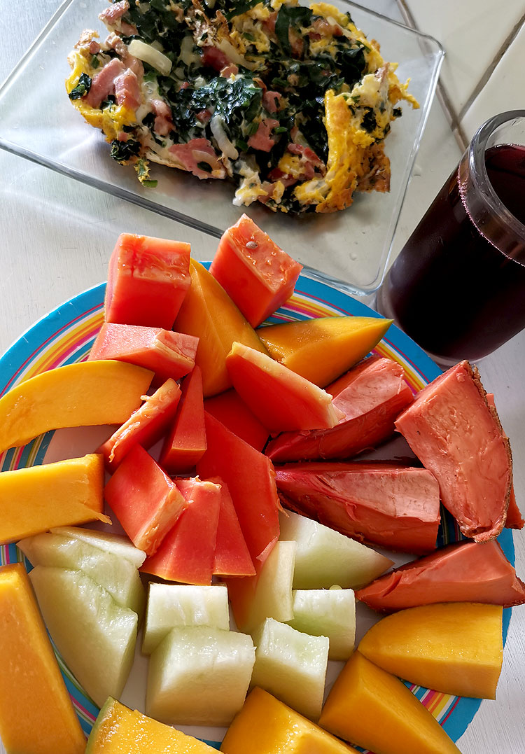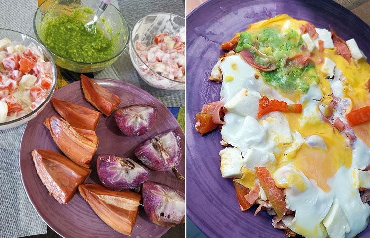 Салат из папайи, гуакамоле-лайт, фрукты (каймито и мамей). Яичница с помидорами, ветчиной, сыром и гуакамоле.