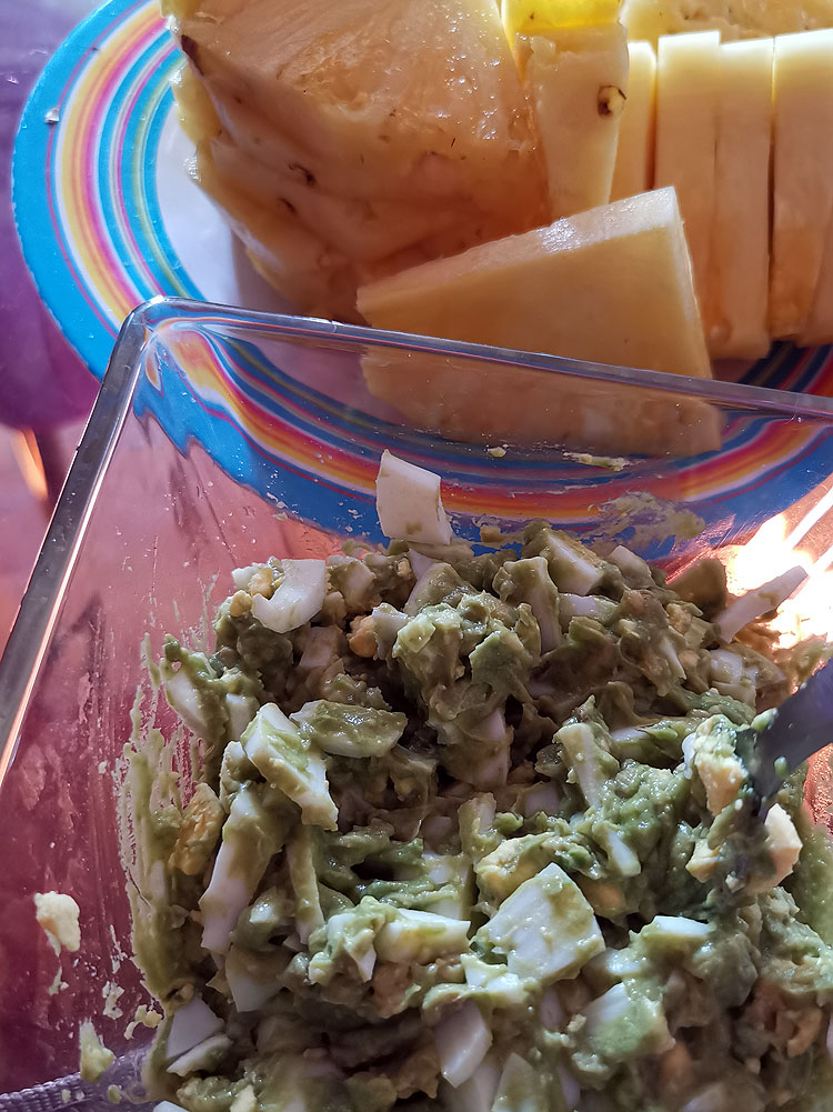 Яичный салат (гуакамоле-лайт из 1 авокадо + 4 яйца). Ананас. Я уже писала, что ананасы тут зашибенные?
