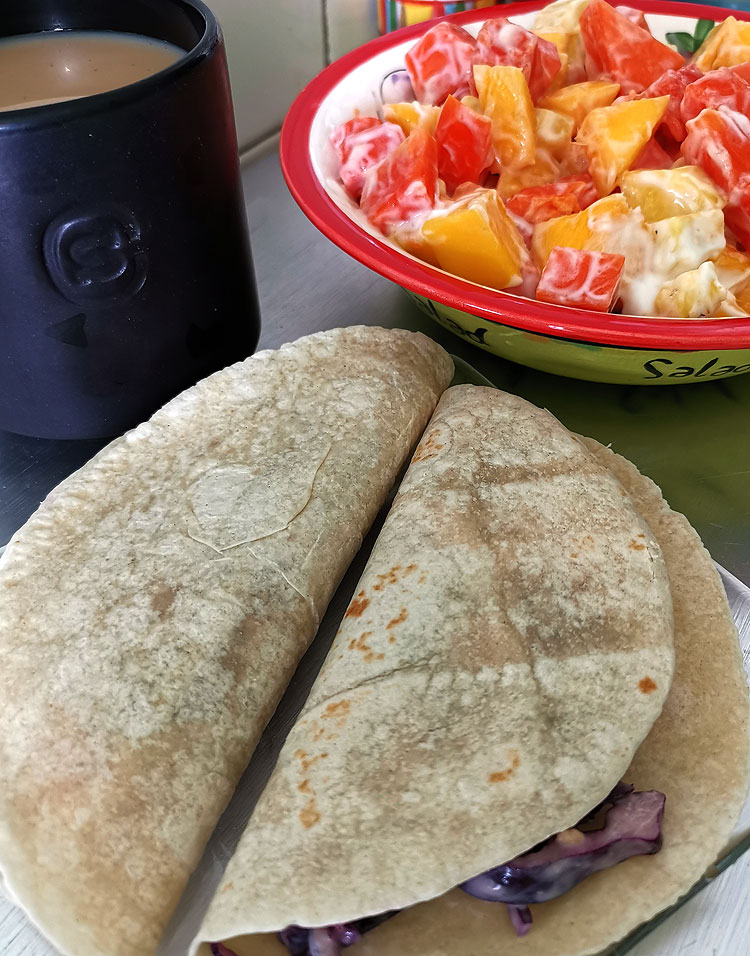 Кофе-кортадо в правильной омской кружке. Салат из папайи и манго. Салат из красной капусты с яйцом, завернутый в пшеничную лепешку.