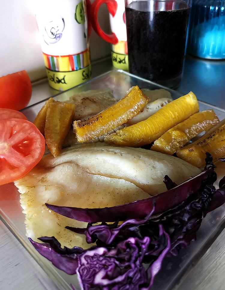 Вода из Ямайки. Рыбка и бананы, запеченные вместе. Помидорка и красная капуста.