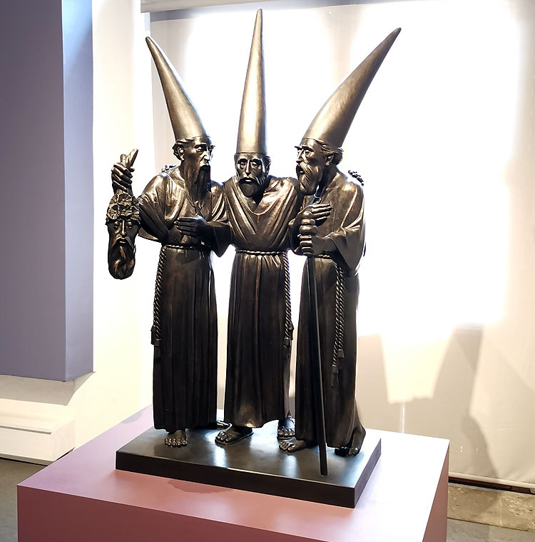 Рафаэль Коронель -- скульптор и художник. Картины у него странные. Кажется, он не нашел в картинах свой стиль, они очень сильно (на мой дилетантский взгляд) не имеют почерка. А вот скульптуры -- мне понравились. Особенно меня зацепила одна серия его работ (которую как раз я и видела частично в музее). Я не знаю, как она называется, я ее называю "скульптуры в шапках".