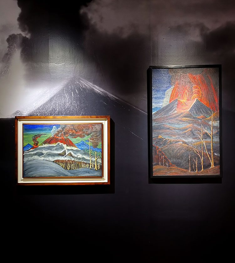 Фредерико Сильва -- муралист (не путать с моралистом). Художник, который рисует фрески во всю стену. Вообще, мурализм Мексика считает своим видом изобразительного исскуства, традиционным и исконным. У них тут очень много художников-муралистов, они такое любят! Муралы его мы, честно признаться, не видели. Но, например, выше -- картина, эскиз к муралу. То есть мурал абсолютно такой же, только где-то во всю стену. Понятное дело, это -- вулкан.