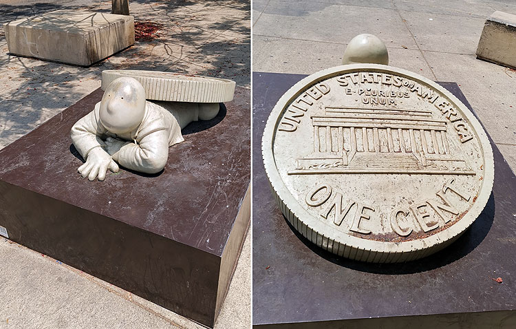 (А это – скульптура Родриго де ла Сьерры. Мне в инста сказали, что похожа на нашего сантехника Степаныча. На самом деле, я-то это не заметила. Так как я сразу знала скульптуру со всех сторон – и у нее совсем другой смысл. Чувачка прихлопнуло американской денюжкой. Больше де ла Сьерры – в инста.)