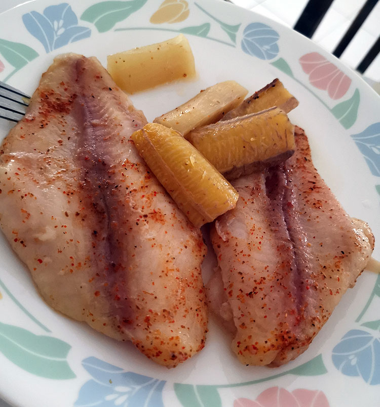 А тут рыба – с бананами и юккой. Юкка очень нравится именно запеченая с чем-то. С рыбой или курицей. Вкусная!