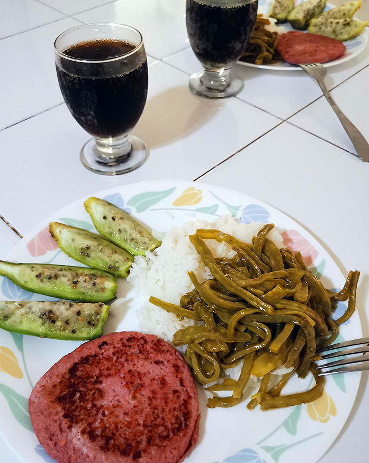 А это будет мое любимое блюдо грядущей недели. Котлета (тут из тунца, но можно любую). Вареный рис. Тушеный нопаль. И плоды нопаля (называются “туна”). Сочетание опять же – отличное. А на заднем плане – Кока-кола, да )))) Хотя по холодным безалкогольным напиткам у мексиканцев тоже хорошо и интересно.