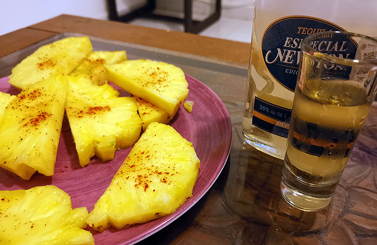 Такое уже показывала. Но еще раз показать – вообще не жмет. Мы такое сильно любим. Когда ананас сладкий и сочный посыпать его красным острым чили. Это прямо мое любимое мексиканское блюдо. К текиле подходит идеально. К вину очень хорошо. Но и просто так, без выпивки – тоже отлично.