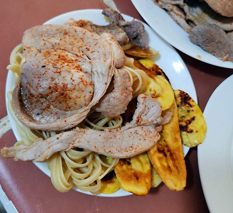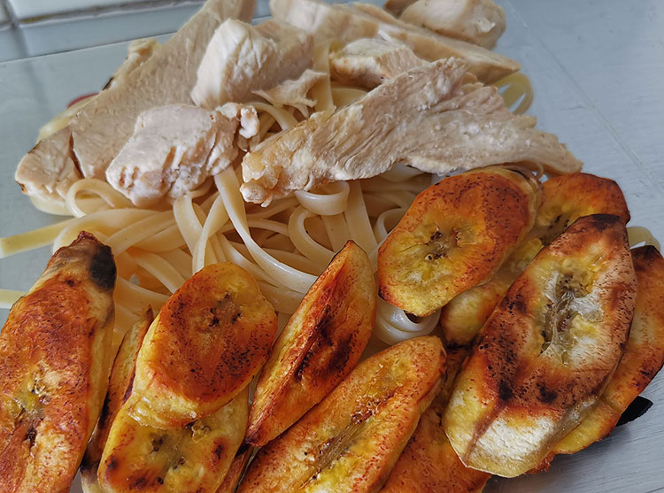 Вот это – то самое мясо, что выше “жарится-варится”. С макаронами и жареными бананами. Жареные бананы – это еще одна штучка, без которой редко какая неделя проходит.