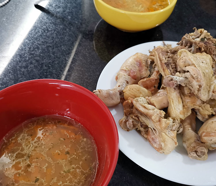 Ну, а это просто куриный бульон и вареная курица. Без лапши.
