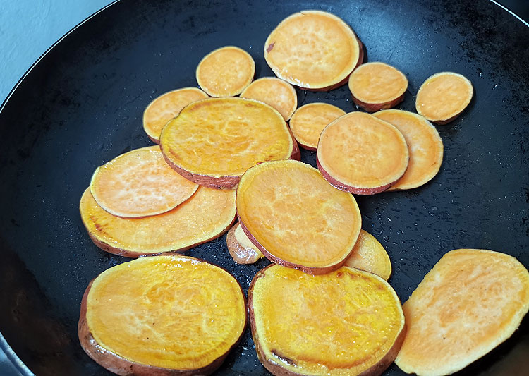 Если у вас хорошее антипригарное покрытие на сковороде, такое мясо можно пожарить без масла. Просто “в собственном соку”. Но у нас на посуточных квартирах сковородки таких фокусов не позволяли. Поэтому я выдумала такой способ. В сковородку налить кипятка, около полсантиметра глубиной. И мясо не то, чтобы жарить. Наверное, правильно это назвать “варить”. Но в таком – бурно кипящем кипятке.