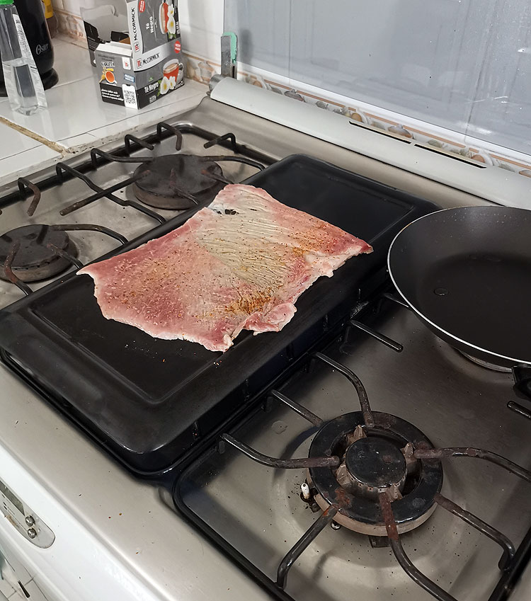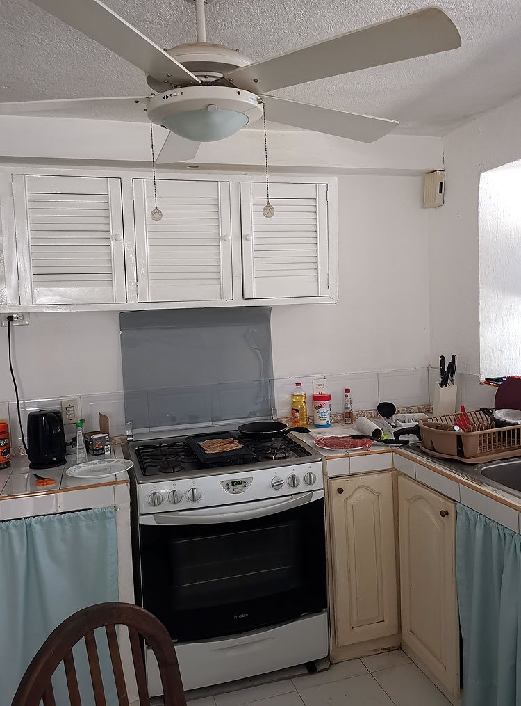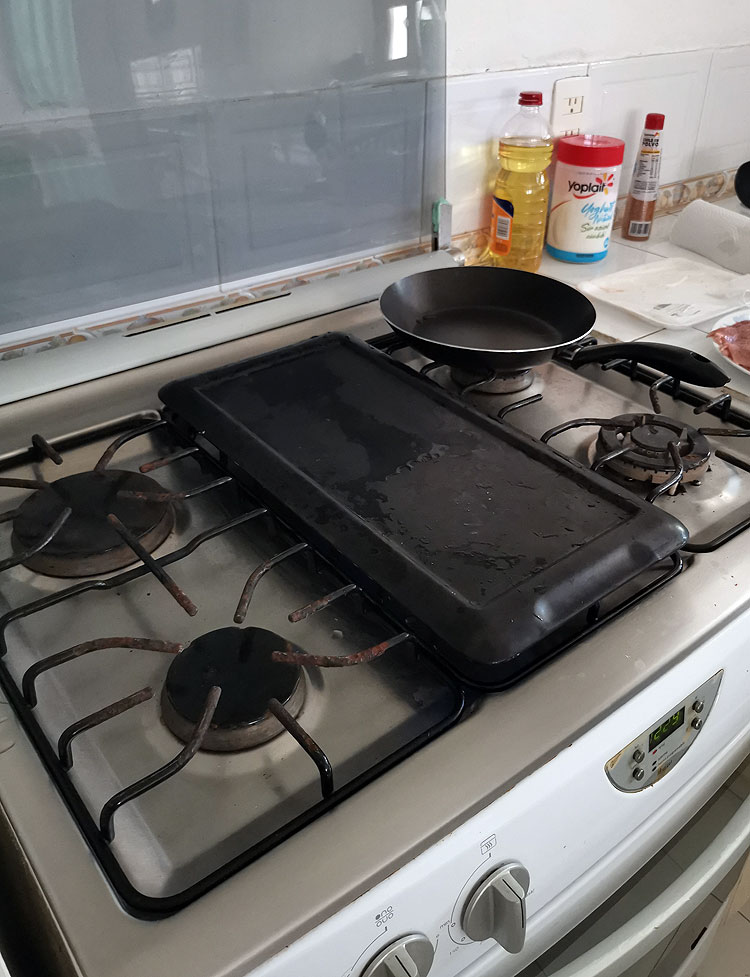 Минус в том, что когда жаришь на плите – в доме существенно повышается температура, очень жарко. Если включить вентилятор – а он реально мощный! и с ним не жарко – то печка перестает давать жар, сковородки остывают, вода не кипит… и вентилятор даже из-под сковородки сдувает огонь (идет газ, но огонь не во всех дырочках). Можно выстуживать дом параллельно кондеем, конечно. Ну, собственно, понятно, почему мексиканцы не так-то часто томят кашу в духовке. Или большой кусок мяса. А все стараются на такой планче по-быстренькому тонкий-тонкий кусок мяса пожарить.