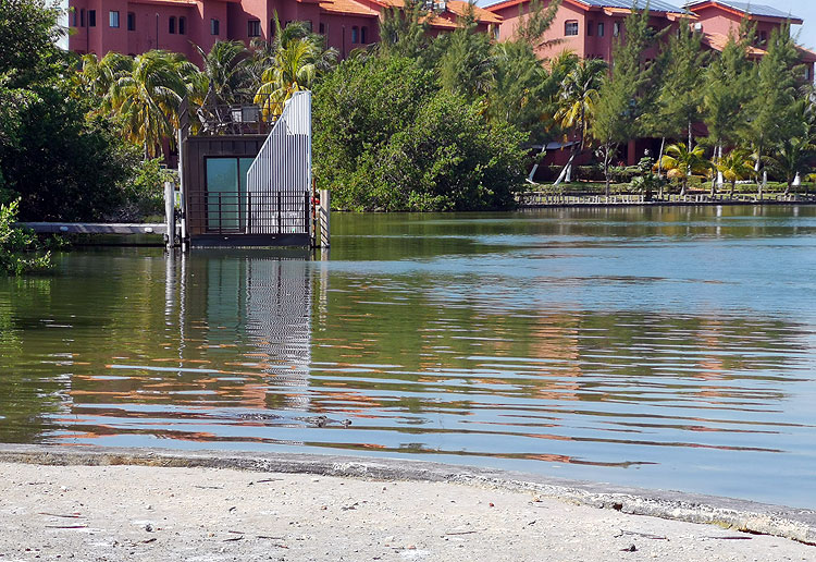 На берег тут он тоже вылезал. Но! Я недавно разговаривала с мексиканцем (лет 30 ему) -- и он сказал, что ни разу за всю жизнь крокодила в Канкуне не видел, они тут не водятся. Ну, то есть крокодилы водятся -- но реально это большая случайность его встретить. Вот, ближе то место, где видно, что...