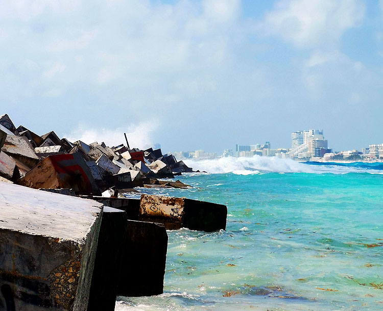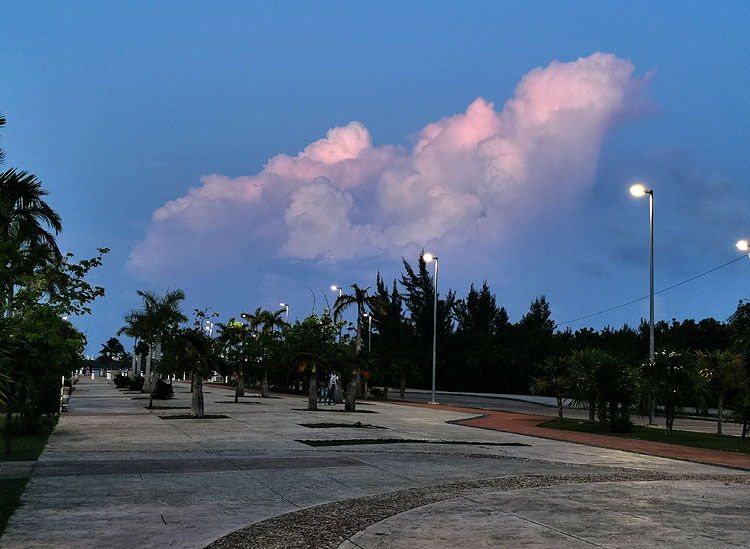 Набережная большая, красивая, современная. После заката сюда высыпает народ. На фото не видно -- но это правда. После заката здесь очень много народа. Катаются на роликах, пускают змеев, едят принесенную с собой пиццу. Тут же проходят какие-то разные мероприятия. Например, недавно был Тур-де-Франс-Канкун (гонка на великах, какое отношение она имеет к Франс не спрашивайте!).