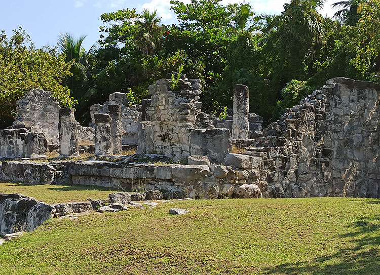 Это маленький городок майя. И зона вообще не такая крутая как Тулум или Чичен-Ица. Но до них надо ехать (около 2-2,5 часов в одну сторону). В Чичен-Ицу еще и дорогой вход. В "El Rey" вход стоит 70 песо (около 4 долларов) и ехать на обычном городском автобусе всего час. Когда выбирали, какие развалины показать Антону -- решили начать с этих. Место не слишком популярное. Никаких толп туристов тут вообще нет (видимо, все ездят подольше и подороже в Тулум и Чичен-Ицу и после этого уже такой маленький городок не котируется). Хотя на самом деле -- полноценный городок. Тут и жилые домики сохранились, и парочка храмов, и невысокая пирамида.