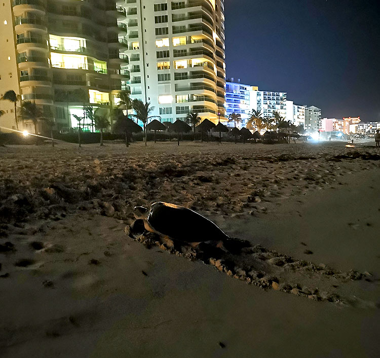 А еще забавная фишка этого пляжа. Именно тут после заката можно бродить вдоль моря (бродить вдоль моря можно не по всем пляжам Канкуна) – и тут выползают на берег морские черепахи на нерест (или как это у черепах правильно назвать?) .