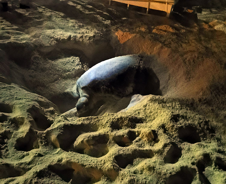 Мы сыну тоже показывали разных животных. Игуан, ясное дело, носух, морских черепах и еще кучу всяких. Морских черепах увидеть оказалось очень легко. Мы трижды ездили на пляж после захода солнца. И все три раза встречали черепах (в каждый приезд не одну, а больше). Мы видели, как черепаха выплывает/вылезает из моря и идет на берег искать место для яиц, мы видели, как черепаха копает яму. Мы видели, как черепаха, чуть потрясываясь, откладывает яйца, мы видели, как черепаха, сделав свои делишки ползет обратно в море. Это все невероятно круто.