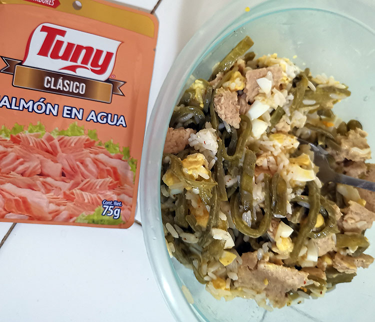 На фото -- стандартный "салат из тунца", но с мексиканским оттенком: соленый огурец заменила на тушеный кактус.