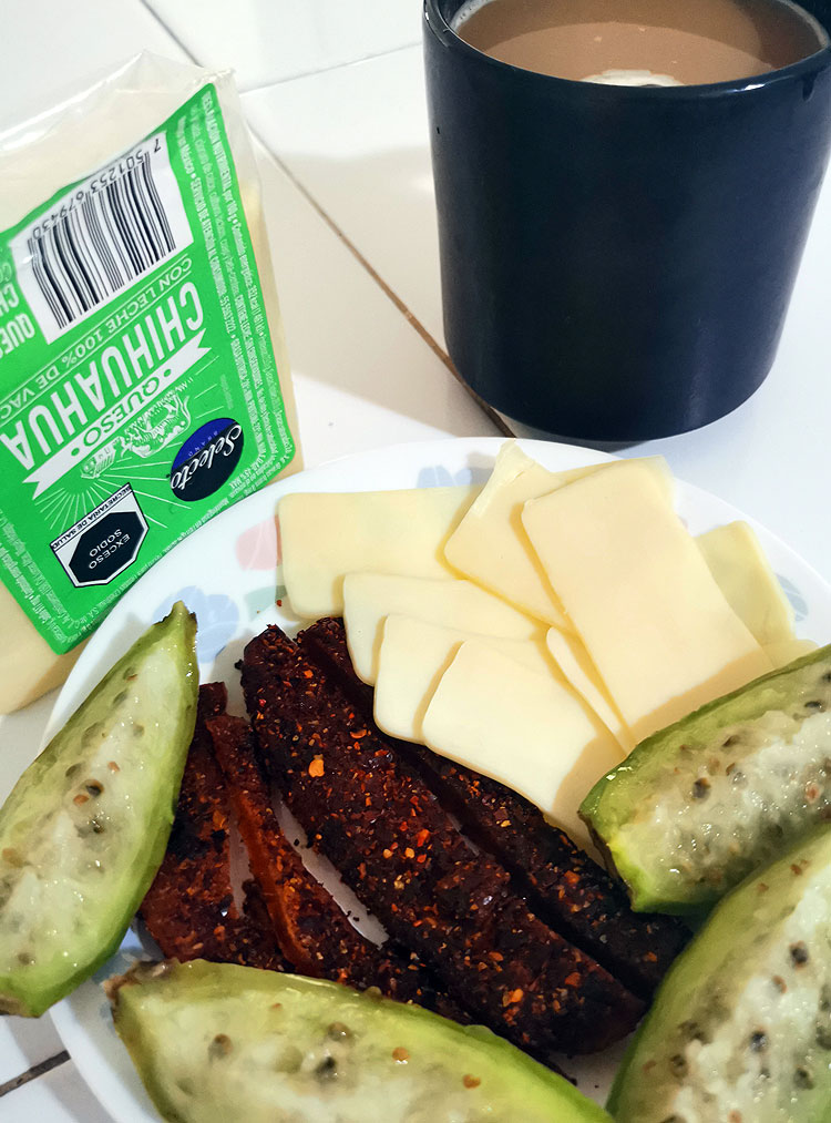 Кофе кортадо. Сыр "Чихуахуа". Манго сушеный в чили. Туна (плоды опунции). Вкусно!