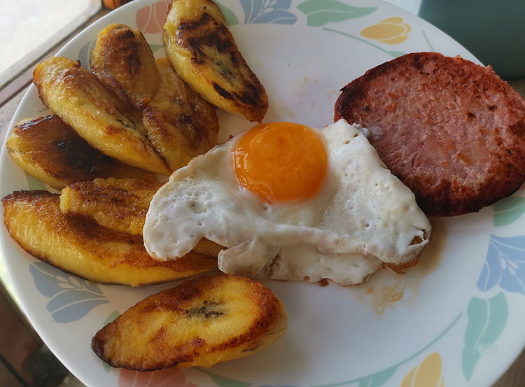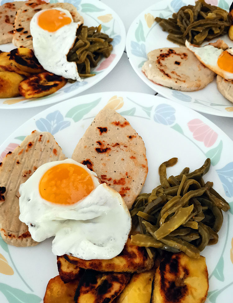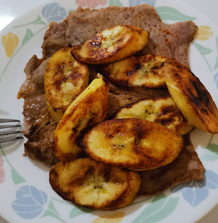 Жареное мясо на планче, которое я уже сто раз показывала. Здесь -- подано просто с жареными бананами. Жареные бананы это вообще классная замена жареной картошки.