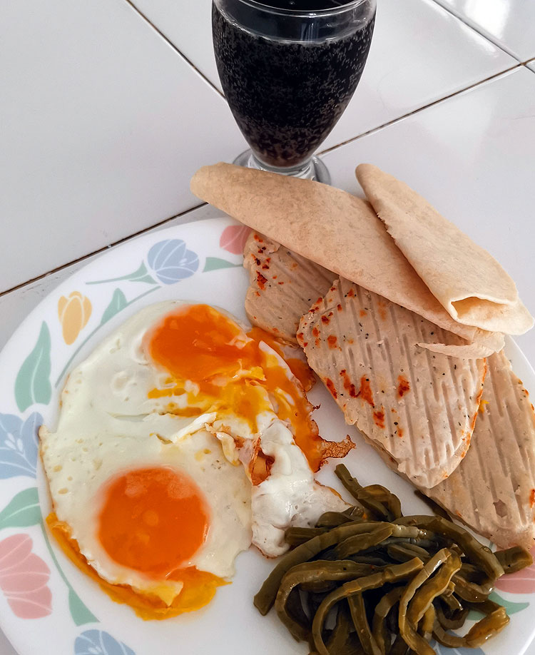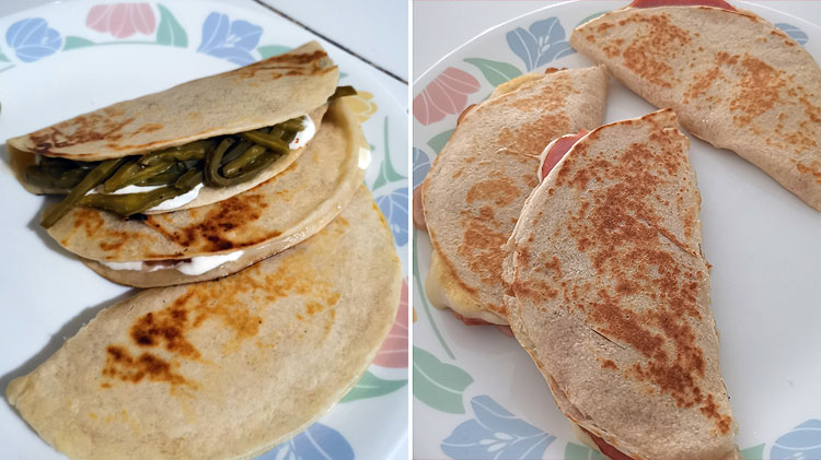 Кстати, вот начинка, которую видно: сыр (типа моцареллы) и плюс тушеный кактус – прямо очень вкусный такос выходит. Сын в таком виде этот самый кактус хорошо поел. (Как ни странно, сыну большинство местных экзотических овощей/фруктов до одного места. Манго он не любит (хотя тут манго идеальные!), папайя не нравится, анона не але. А вот кактус/опунция/нопаль зашел как в виде тушеного стебля/листьев (или как правильно сказать для кактуса), так и плоды).