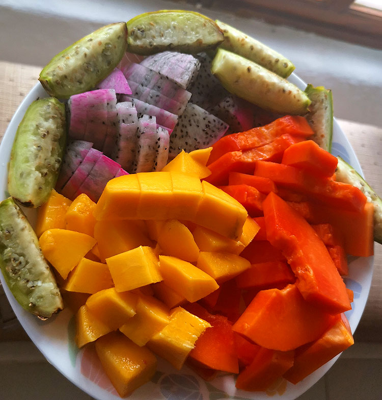Папайя, манго, питахайя, туна. Короче, просто фруктовая тарелка с самыми дешевыми сезонными фруктами.