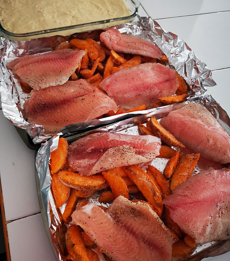 На фото – редкий случай, когда я здесь запекаю рыбку с картошкой. (Обычно с юккой, бататом или бананом). Дело в том, что сын, пока гостил, купил картошку “3 пакета по цене двух”. И два пакета съел, а третий вот болтался. Добавила картошку к рыбке.