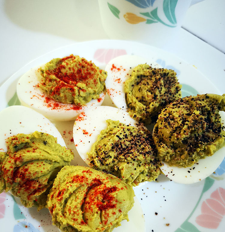 Я не помню, показывала ли фаршированные яйца из Мексики. Все как обычные фаршированные яйца, только вместо майонеза -- гуакамоле.