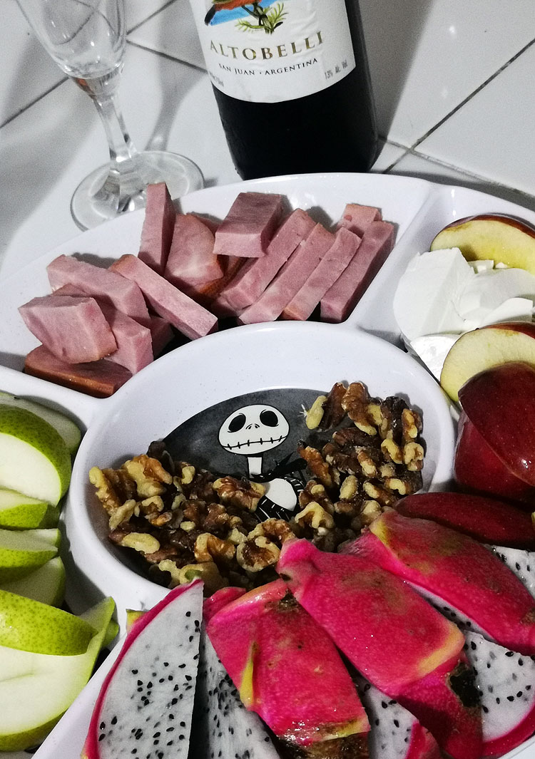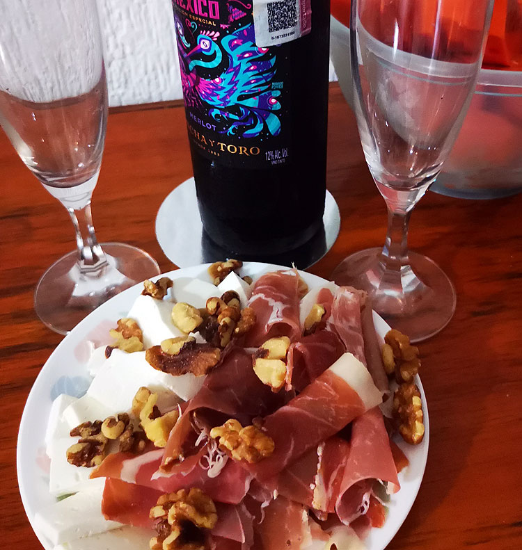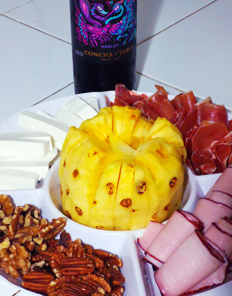 Хамон, копченое мясо, сыр, два вида орешков, ананас. Мексиканское вино.