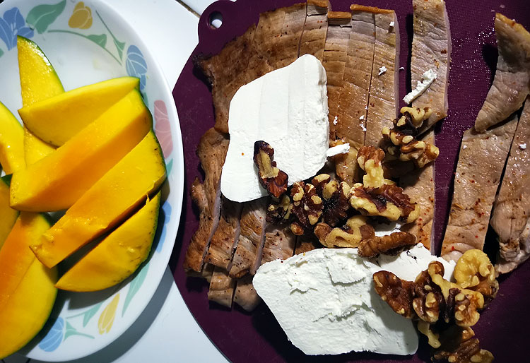 Манго. Жареная свинина, порезанная кусочками (примерно такая). Орехи. Сыр.