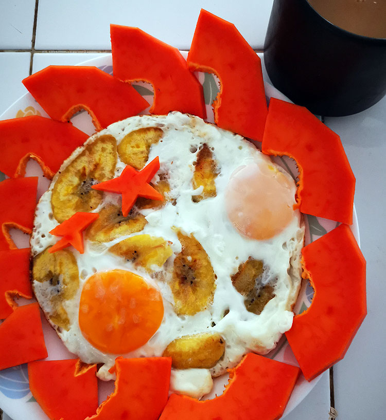 Яичница с бананами (это очень вкусное сочетание). Папайя. Кофе-кортадо.