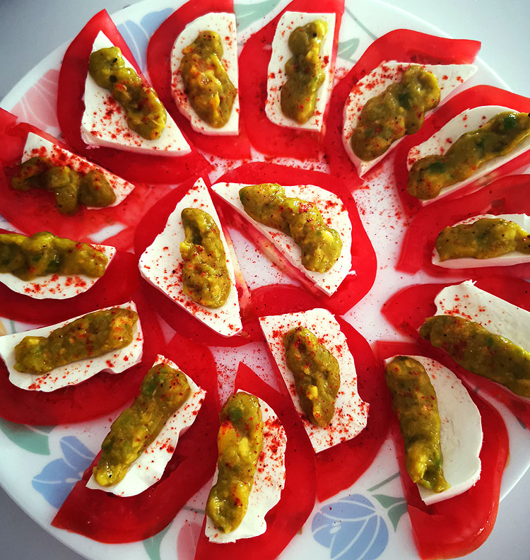 Помидор порезать ломтиками. Чуть-чуть, буквально пару крупинок соли на него. Ломтик моцареллы поверх. А вместо песто зеленый соус – гуакамоле. Если в данном случае сделать гуакамоле чуть-чуть с чесночком – будет идеально.