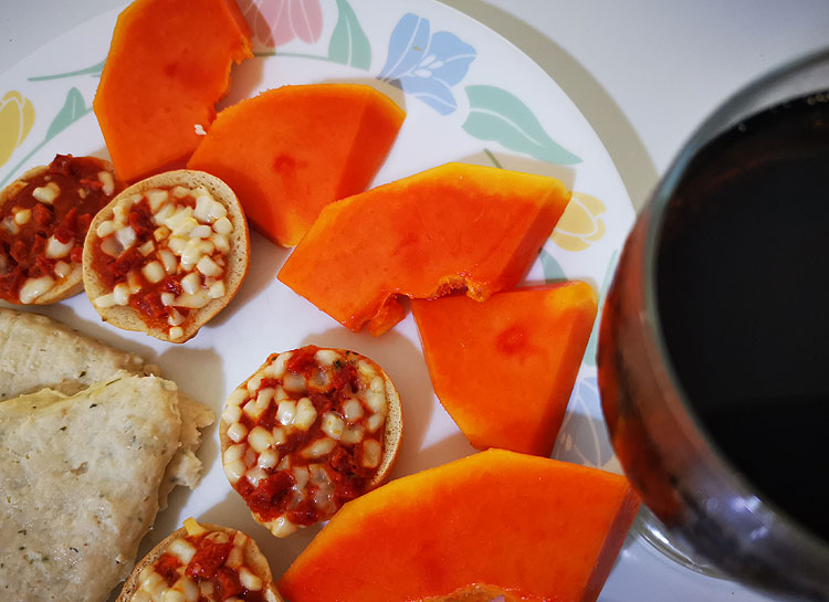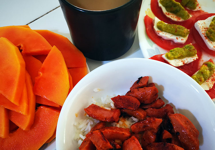 Кофе-кортадо. Капрезе-мексикано. Сосиски чамойадо. Папайя.