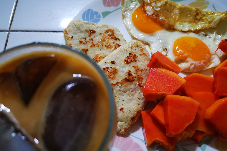 Айс-латте. Куриный шницельки. Папайя. Глазунья обыкновенная.