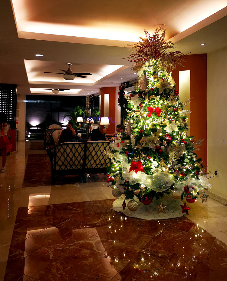 - А это -- наряженная елка не в магазине, а в холле отеля, куда любопытные могут заглянуть с улицы.