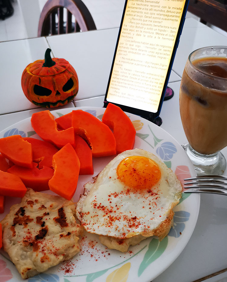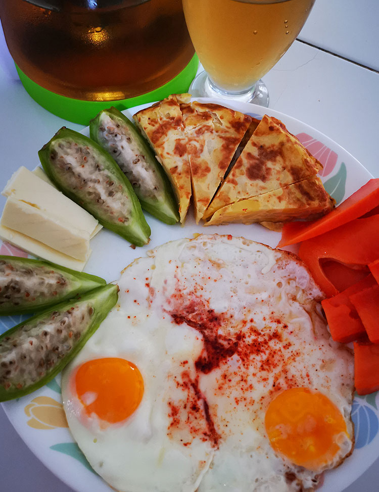 На фото: имбирный чай; остаток тортильи; самая простая глазунья без ничего, но с перцем чили; пара кусочков сыра панела (местный сорт сыра, что-то среднее между моцареллой и сулугуни); папайя и туна. Наверное, последняя туна в этом году – сезон кончился.