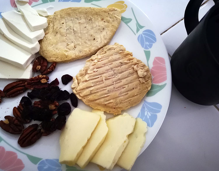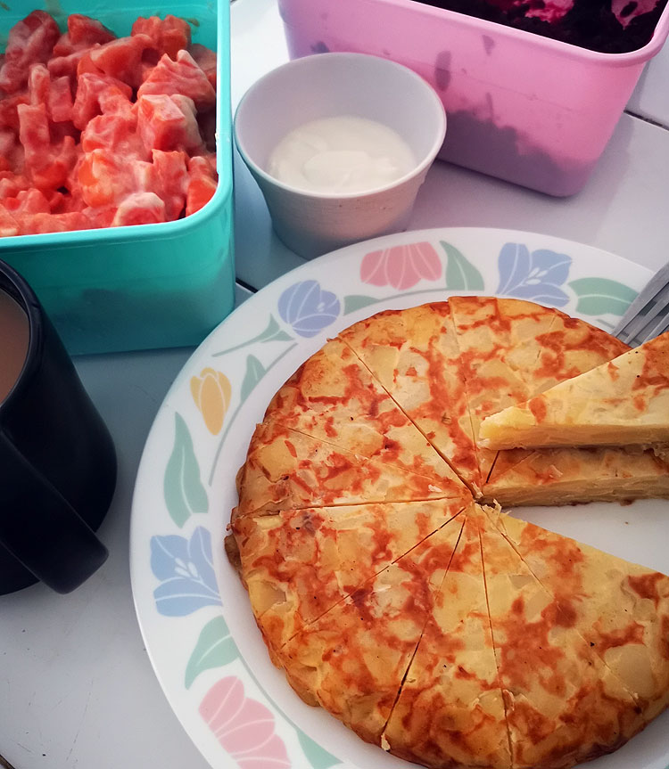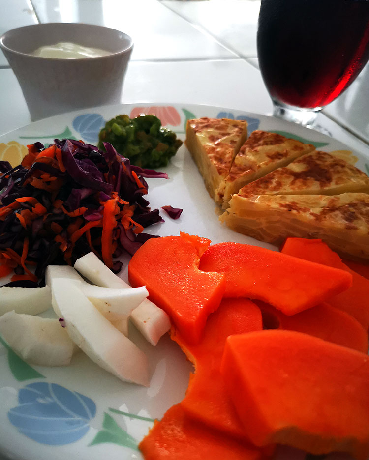 На фото: кофе кортадо; тортилья и к ней “сметанка” (в роли сметанки – йогурт); свекольный салат; салат из папайи.